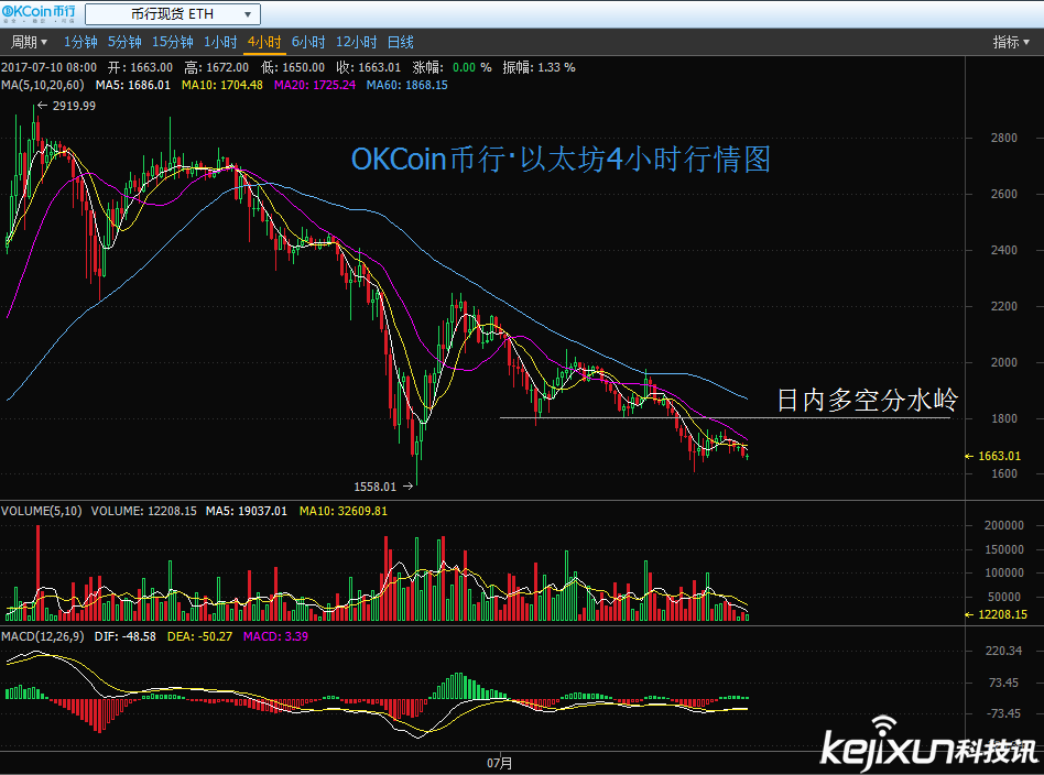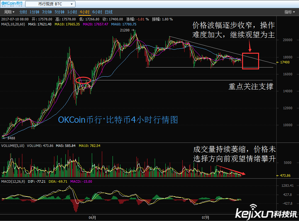 7 月 10 日消息,按照国内知名的数字资产交易平台OKCoin币行的数据显示,比特币昨天( 7 月 9 日)价格仍旧呈震荡盘整状态运行,日内波幅仅3.16[%],这种状态已经延续了超过 10 个交易日。截止今日发稿前,价格弱势震荡下行,最新价交投于 17360 附近。