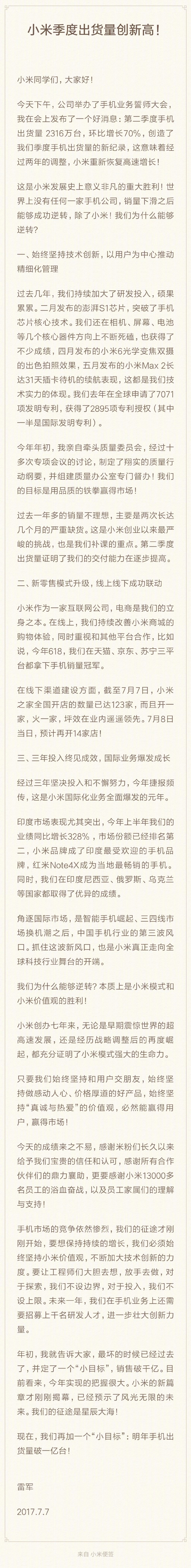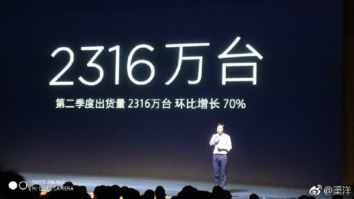 站长之家(Chinaz.com) 7 月 7 日消息 今天下午,小米公司举办了手机业务誓师大会,并对外公布了第二季度手机业绩,手机出货量2316 万台,环比增长70%,创造了小米季度手机出货量的新纪录!