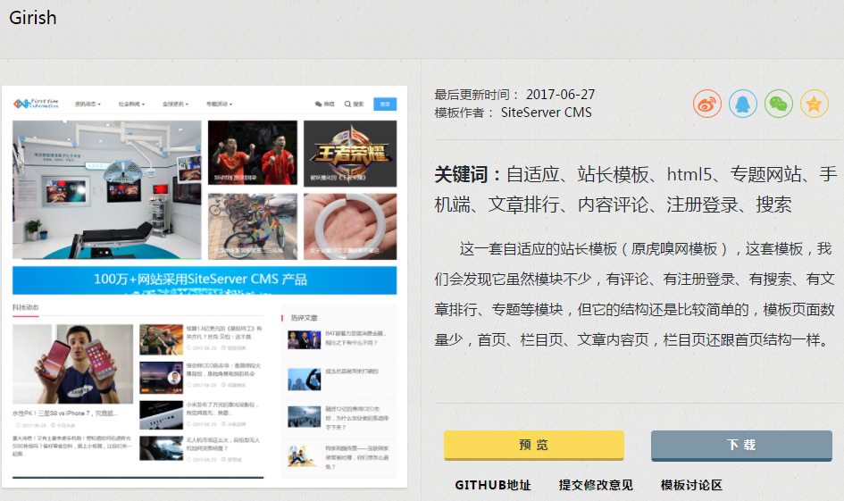 响应式模板中心除了模板展示和下载之外,还为每一套模板创建了一个github项目,官方会为每一套模板不停的进行修改完善,用户可以看到一套模板的差别版本。同时广大用户也可以fork模板项目然后参与模板的维护更新并向官方提交本身修改过的版本。