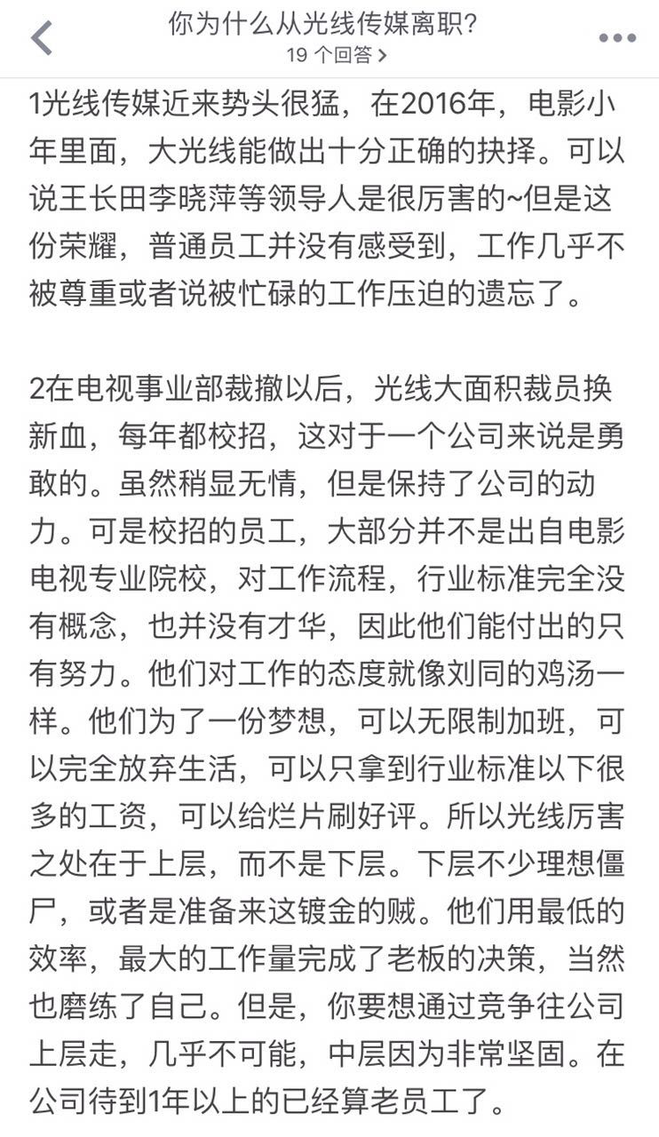 而知乎上也有疑是光线传媒前员工的网友体现了关于对光线传媒裁员的看法,“在电视事业部裁撤以后,光线大面积裁员换新血,每年都校招,这对于一个公司来说是勇敢的。虽然稍显无情,但是连结了公司的动力。可是校招的员工,大部分并不是出自电影电视专业院校,对工作流程,行业尺度完全没有概念,也并没有才华,因此他们能付出的只有努力。”