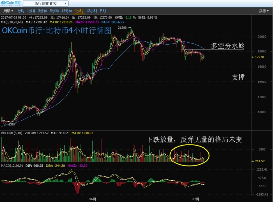 OKCoin币行分析师称,日内来看, 4 小时级别,均线系统(5、10、20)在粘合后转向下发散状态,同时MA60 下行行心率增大,价格在向下破位时明显放量,反弹无量,本级别继续看空; 1 小时级别,价格虽然未能有效下破 16700 支撑,但是随后的反弹显示多方亦无力继续反攻,MACD维持在零轴下方弱势区域运行。