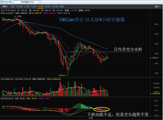 综上所述, 4 小时级另外偏中期走势偏空格局不乱,同时价格在反弹回升时没有明显的资金介入迹象,这说明市场整体对多头缺乏信心,在这种市场配景没有明显发生改变前位置主要的空头思路操作,也就是参与的性质都应该是短线反弹行情。日内多空分水岭关注 2030 一线,未放量上破前不要追涨;下方支撑关注1500— 1600 区间,此区间可短线参与。