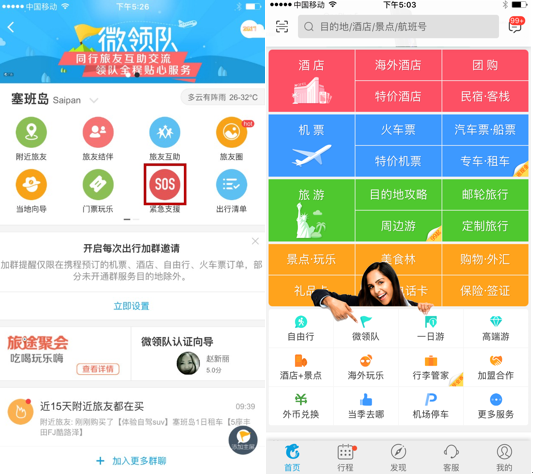 (打开携程app首页,即可找到“微领队”进入微领队首页即能找到SOS功能,一键求助)