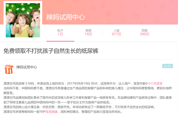 搜索漂漂羽毛,小编发现,其旗下有一款纸尿裤产品正在几家知名的母婴社区开展试用活动,部分运气好的网友已经提前拿到了漂漂羽毛纸尿裤的试用资格。