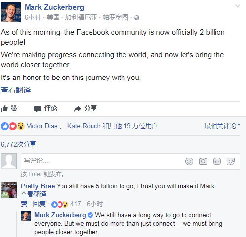扎克伯格颁布颁发了这一里程碑数字,并体现,要“让世界更加紧密相连”(let's bring the world closer together)。