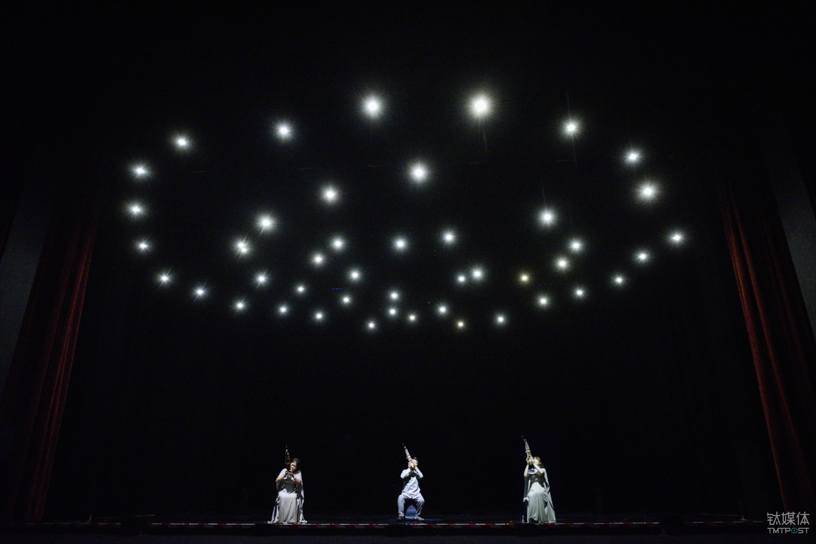在这出作品中,唯一一个没有可以制造形式冲突的表演是笙乐吹奏和80架无人机共同组成的表演,在这个由吴彤、郑杨、陈人杰三位古乐表演者和无人机团队完成的演出中。我们注意到,无人机所代表的现代技术和笙乐代表的传统文化之间并没有呈现出其他节目刻意透露出的冲突感,两者之间更像是天然互补与融合的浑然整体。