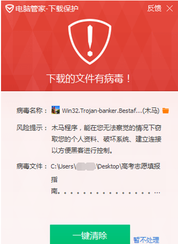 去年,,就有伪装成《高考志愿填报指南》的网银木马文件被腾讯电脑管家查杀。一旦考生下载运行,病毒就会入侵考生电脑,导致电脑中的网银帐号密码等敏感信息被盗,甚至还能篡改转账金额和收款帐号。不但泄露用户重要个人信息,更会对用户的财产安适构成严重威胁。
