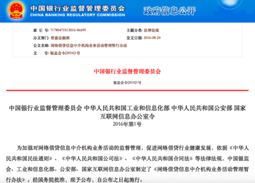 2015年12月,《网络借贷信息中介机构业务活动办理暂行措施(征求意见稿)》发布,提出了网贷经营的12条禁令。2016年8月《网络借贷信息中介机构业务活动办理暂行措施》正式出台,在《征求意见稿》的基础上进一步完善和细化。