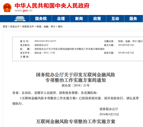 2016年10月,国务院办公厅公布了《互联网金融风险专项整治工作实施方案》,明确P2P网络借贷领域的整治重点是落实网络借贷机构信息中介定位,禁止网络借贷机构突破信息中介本能机能定位开展设立资金池、自融自保、发放贷款等违法违规活动。方案对互联网金融风险专项整治工作进行了全面安排摆设。