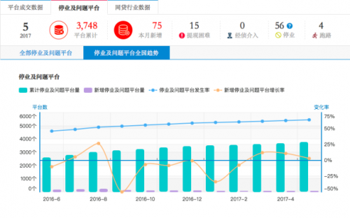 据网贷之家数据显示,本年以来正常运营平台已由1月的2388家降至5月的2148家;跑路、提现困难平台共有88家;转型平台共有20家,相较以往,每月数量均处于相对不变状态。此外,停业平台数量每月呈递增之势。本年1月~5月,停业平台数量别离为33家、45家、49家、50家、52家。