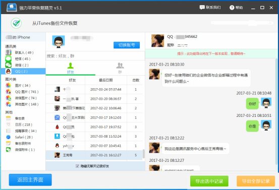 第四步:扫描结束之后,在左侧的通讯类中找到“QQ”一栏点击,旁边出现有账号以及好友列表,点击列表中的任意一个右侧都会显示详细的聊天记录,以此方式确认好需要的聊天记录之后点击“导出选中记录”按钮,软件就开始恢复了。
