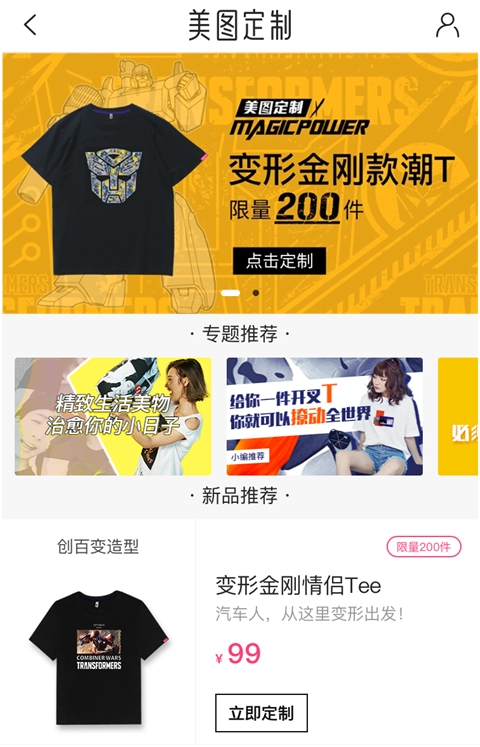 好比,美图定制与西班牙百年床品品牌Velfont联名定制的防螨枕套引起注重品质与健康生活的年轻人的关注。承袭时尚环保理念的全球知名环保袋品牌ENVIROSAX, 和英国复古时装品牌的领军者Miss Patina也已经与美图定制达成合作,授权推出品牌联名定制款。6月22日,美图定制更是为用户提供了限量200件的变形金刚联名定制款T恤。