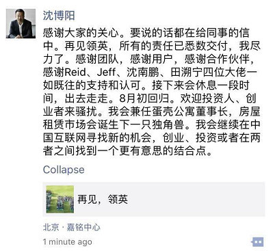 感谢大家的关心。要说的话都在给同事的信中。再见领英,所有的责任已悉数交付,我尽力了。感谢团队,感谢用户,,感谢合作伙伴,感谢Reid、Jeff、沈南鹏、田溯宁四位大佬一如既往的支持和认可。接下来会休息一段时间,出去走走。 8 月初回归。欢迎投资人、创业者来骚扰。我会兼任蛋壳公寓董事长,房屋租赁市场会诞生下一只独角兽。我会继续在中国互联网寻找新的机会,创业、投资或者在两者之间找到一个更有意思的结合点。