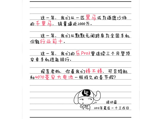 2016年的最后一个工作日,乐视手机官方高调秀出2016年战绩:销量迫近2000万台,位居全国手机市场份额前十,“已经从一匹黑马成为了逐鹿沙场的千里马。”。