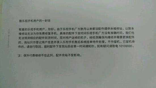 同时,乐视手机维修站致用户的一封信也被登出,信中称乐视手机厂方已经几个月没有提供配件了,无法继续免费维修手机,配件何时重新到货也没有准确时间,因此送修的机器只能暂时仅做登记,等待处理,已经留下机器待修的也要自行取回。