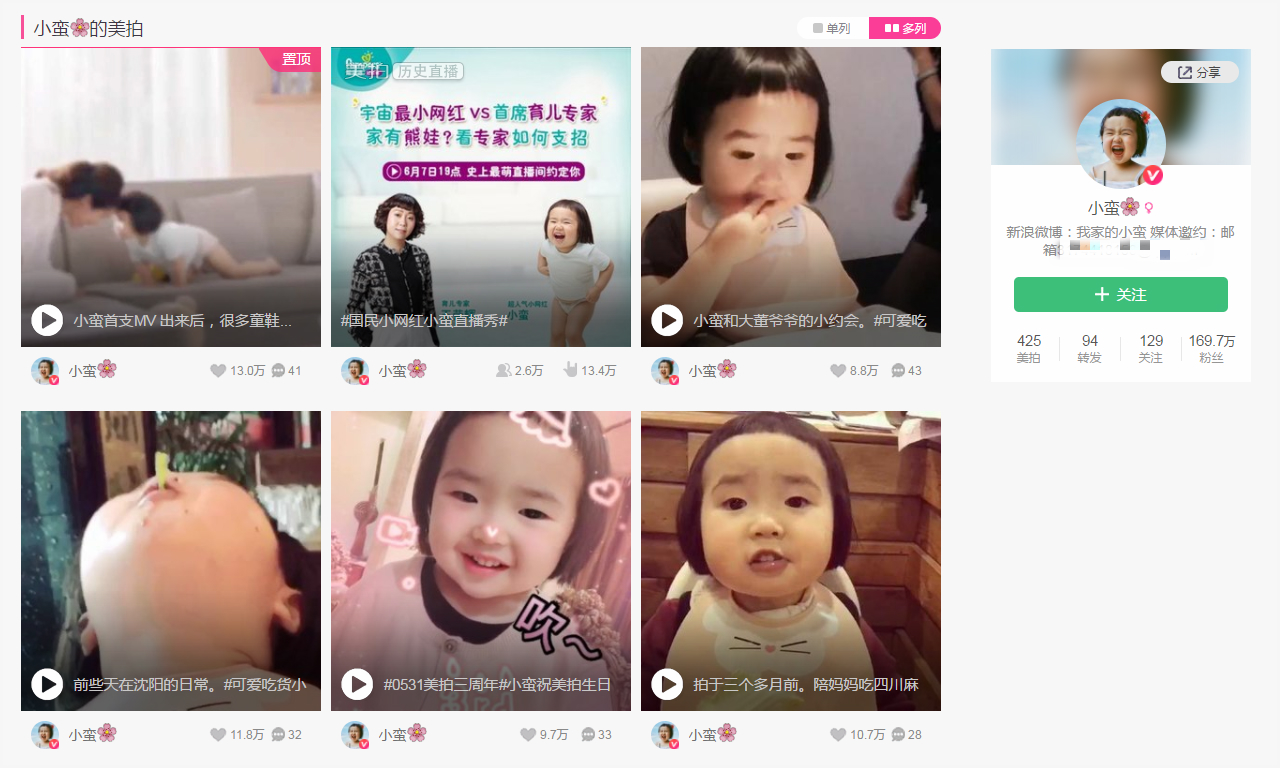 Ryan ToysReview单次播放量达7亿在美拍上,4岁半的小山竹拥有145万名粉丝,已经成为美拍上的“小网红”。在小山竹2岁时,山竹妈妈就开始在美拍上分享女儿的一些日常视频。视频发布后,小孩可爱的形象吸引了一批粉丝的喜爱与关注,美拍上的小视频点赞基本过万。