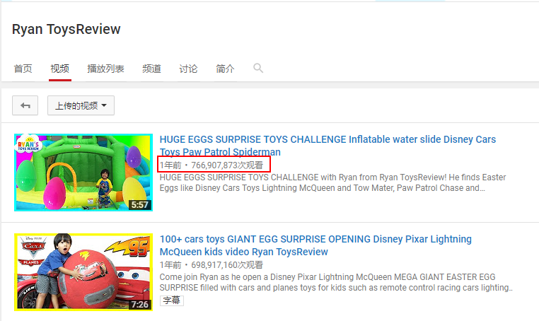 在YouTube上,一个5岁的小男孩Ryan创立了本身的频道“瑞安玩具测评”(Ryan ToysReview)。Ryan是视频的主角,他负责在大人们的帮手下测评各种好玩的玩具,有时候还会做一些科学实验。这些内容吸引了一大批粉丝,注册两年来,频道订阅量已达到770万,视频最高播放量达7亿。按照socialblade的估算数据,该频道年收入在350万美元到5500万美元之间。
