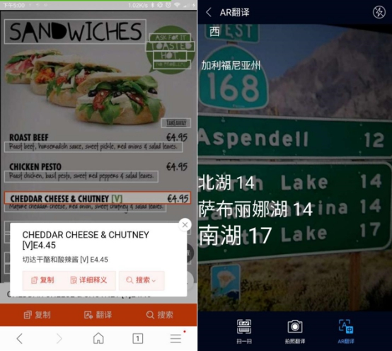 在国外的餐厅用餐,面对看不懂的全英文菜单常常会点错餐,用搜狗手机浏览器的AR实时翻译功能就可制止尴尬。只需点击搜索栏右侧的