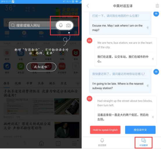 搜狗手机浏览器的语音对话翻译功能操作十分便利,点击搜索栏右侧的“话筒”即可进入语音对话翻译功能。当你需要与外国人进行对话时,只需按住蓝键说中文,或按住红键让对方说英文,语音对话翻译功能将你们说的话翻译后,会以对方的语言说给对方听,同时屏幕上也会显示对话的文字记录和翻译结果。比拟需要其他翻译软件,搜狗手机浏览器的对话翻译结果准确度更加高,操作也更加简单便利。
