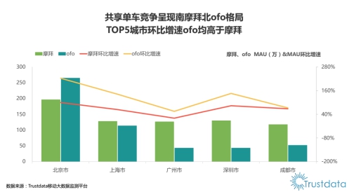 Trustdata研究还显示,北京的ofo月活用户更是超过 250 万,活跃度高居所有城市榜首,而摩拜在北京月活用户不足 200 万,ofo在北京的活跃用户数方面要高出25%之多。而这五大城市的月度活跃用户增长方面,,ofo也是大幅超越摩拜,说明ofo在核心城市的品牌形象最好,获得了更多用户的喜爱。