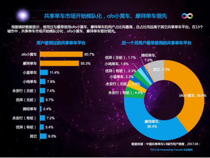 本着用户至上的初心,ofo对小黄车的每个设计生产环节都以深度满足用户需求为宗旨,因此得到了用户的广泛青睐。国内第三方权威互联网数据机构DCCI最新发布的《中国共享单车 13 城市用户研究陈诉》显示,ofo活跃用户份额占比为39.8%,摩拜活跃用户份额占比为36.4%,ofo活跃用户份额远超摩拜,居行业第一。