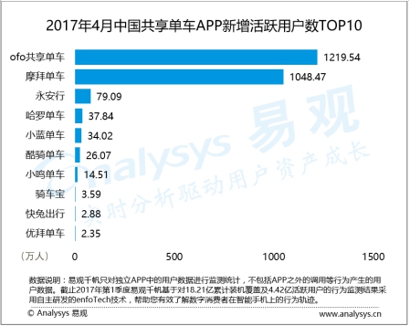 按照第三方权威数据机构易不雅观发布的最新数据, 2017 年 4 月,ofo小黄车APP新增活跃用户数为1219. 54 万人,排名行业第一。不但如此,ofo小黄车的新增活跃用户数超过摩拜单车、永安行、哈罗单车、小蓝单车的总和,ofo共享单车“一哥”的地位实在是无法撼动。