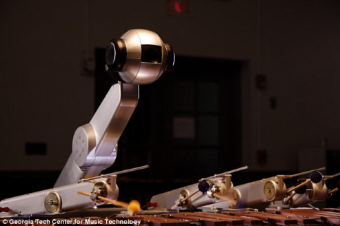Shimon机器人有四个手臂和八根棍子,可以在marimba上演奏和声和和弦。它更像一个人类音乐家,更少关注下一个音符,更多地关注作曲的整体结构。