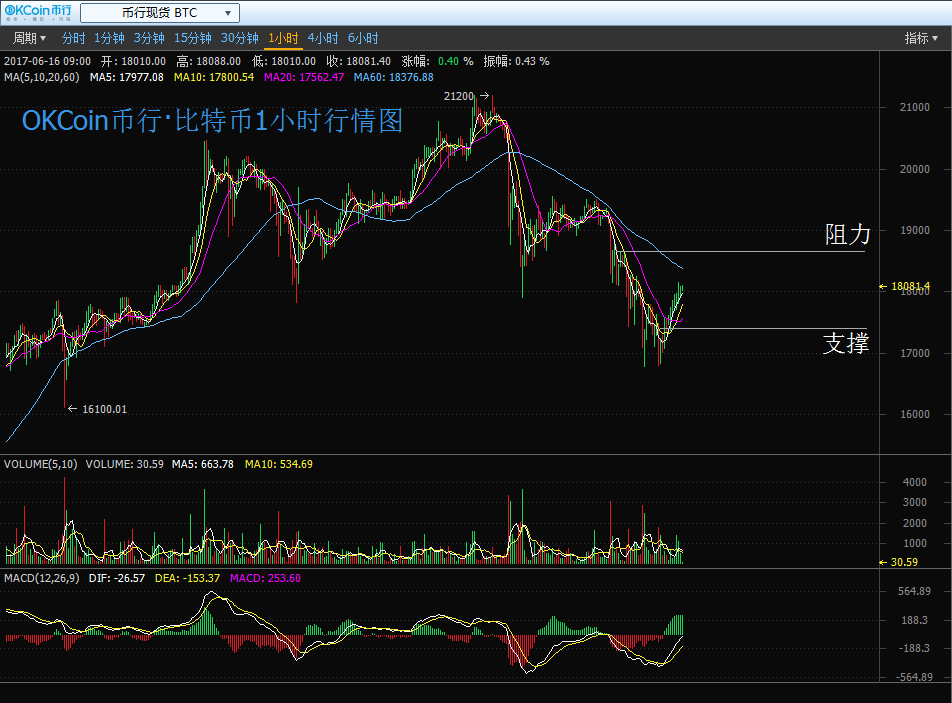 按照国内知名的数字资产交易平台OKCoin币行的数据显示,昨天(6月15日)比特币价格开市后至收盘的绝大部分交易时段呈震荡下行态势,日内最低触及16760一线低位。截止今日发稿,价格已经触底回升,最新交投于18000附近。