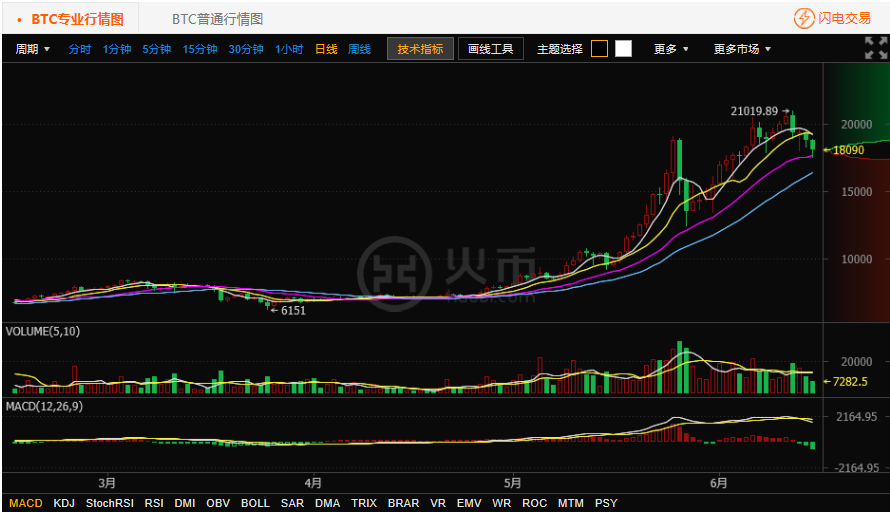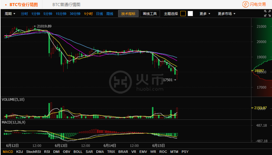看火币网比特币行情日线图。火币网比特币价格最高从 21000 元至今晨连续调整 4 日最低跌至 17501 元,支撑位 18000 元被放量击穿,但从成交来看,仍然未出现恐慌性抛压。看火币网比特币行情小时图。昨天晚间 21 时,受近期国际国内的利空消息预期的影响,放量向下突破近两日横盘的箱体下沿,开始一波向下的阴跌,且跌幅较大,目前在 17501 元成交量有所放大,表白有部分抄底盘进入。整体空头局势已经出现,火币网温馨提示:投资有风险,入市需谨慎。