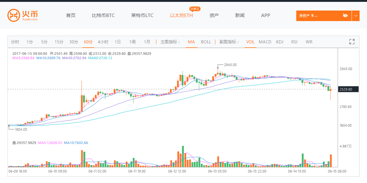 按照中国安适可信赖的以太坊交易平台火币网行情显示,截至北京时间 6 月 15 日 10 点,以太坊价格为2529. 8 元人民币。火币网以太坊今日开盘价格为 2669 元,目前最高价格 2678 元,最低价格为2513. 01 元,,跌幅5.2%。