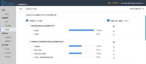 互动问卷就是调查问卷的形式,差别之处在于云视互动在常规问卷的基础上按照市场推广和经验积累增添了一套用户价值算法,其中最有价值的就是标题问题权重的专业算法,从标题问题设置、权重比值到问卷统计、价值排序,一气呵成,智能评分,量化培训效果。