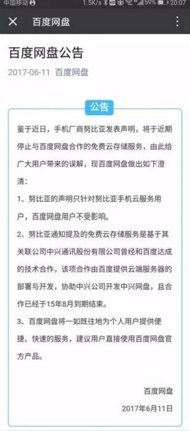 5、百度网盘要停服?官方公告:只针对努比亚手机云办事