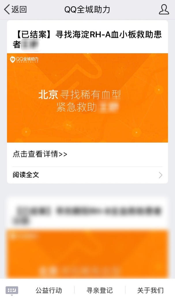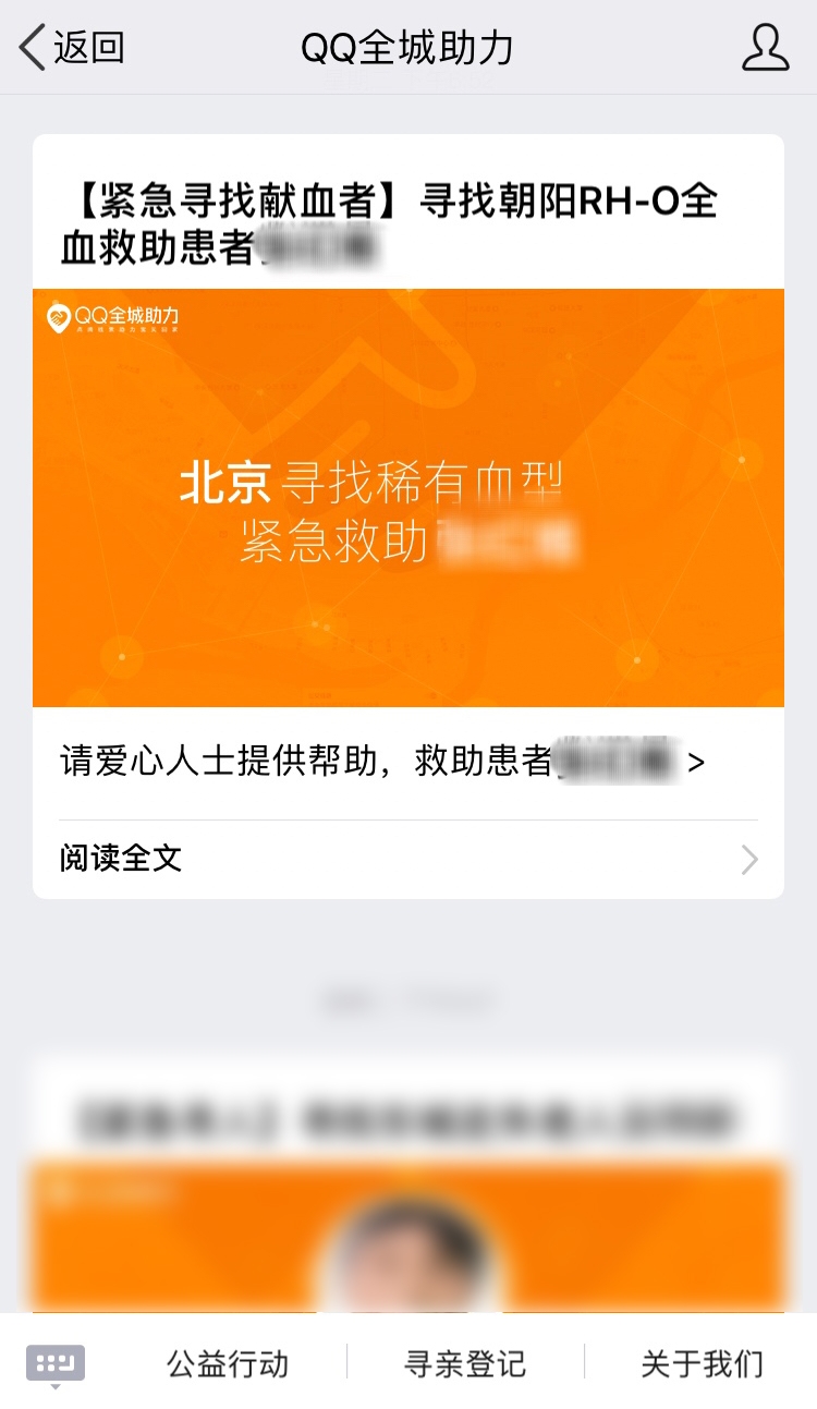 同时,与传统寻人方式比拟,QQ全城助力发布的信息更具备可控性。例如传统稀有血型公益组织会借助QQ群、伴侣圈等社交媒体平台扩散求助信息,但是当匹配成功后相关消息还是会在社交平台继续扩散;而在QQ全城助力中,当成功寻找到志愿者后会推送“已结案”的信息,使求助信息可控,进而为社会节省公益资源。