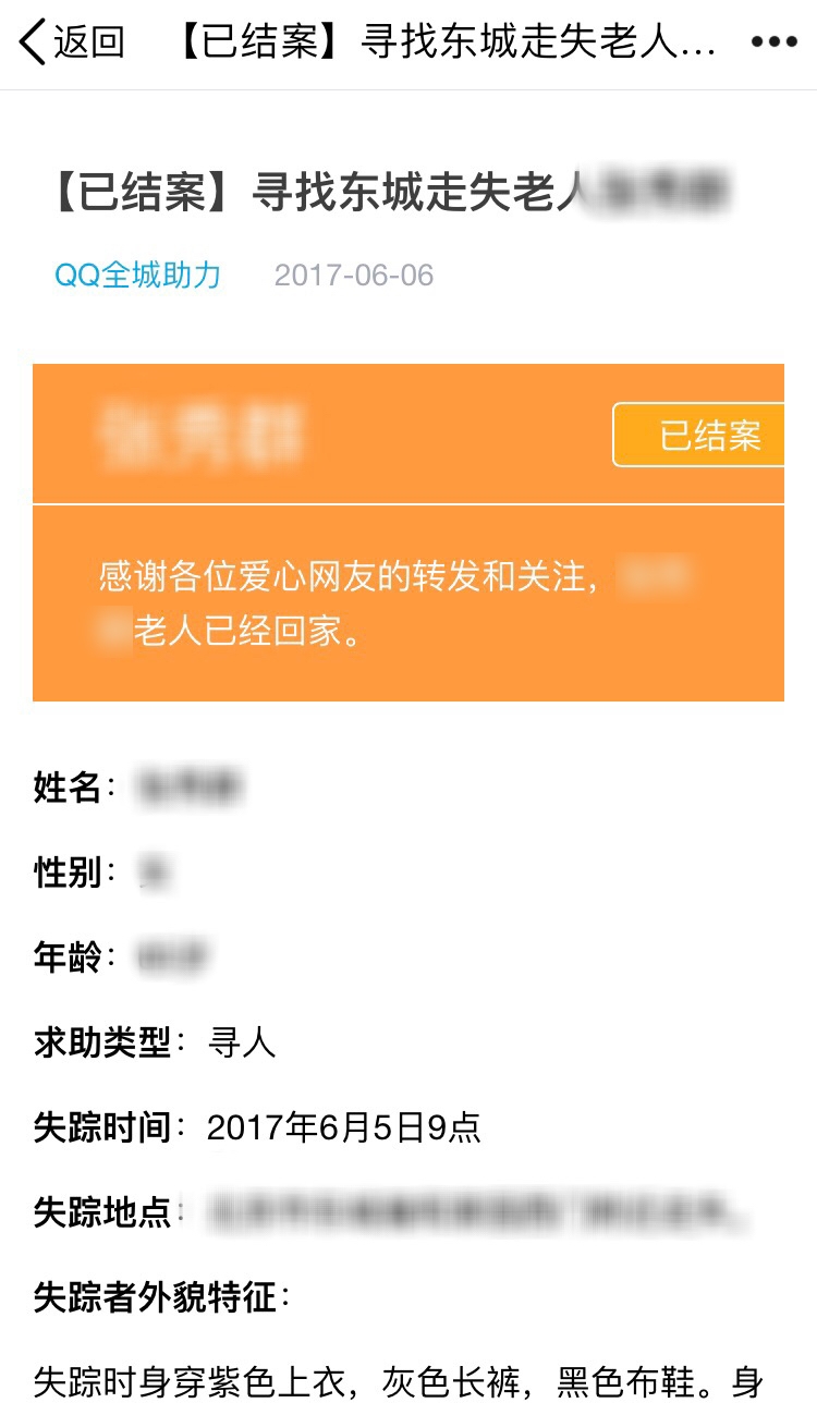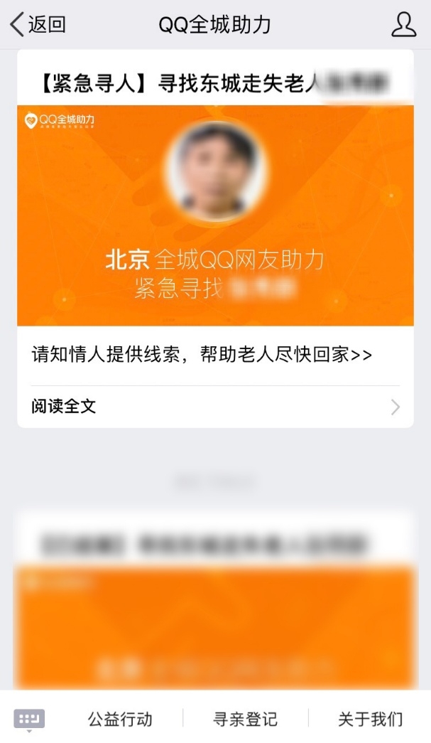 除了帮手稀有血型患者匹配志愿者外,QQ全城助力2. 0 通过与联合公安部、民政部以及权威NGO组织的深度合作基于人脸识别及LBS技术精准定位、识别走失白叟信息,共向志愿者推送走失白叟信息,成功寻回 6 名离家走失白叟。
