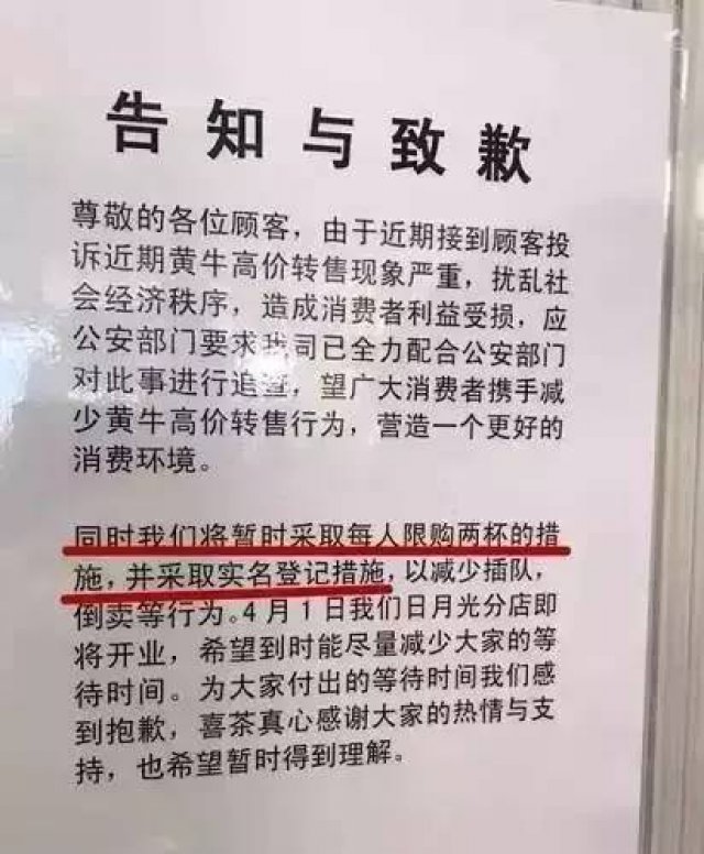 除以上外,购买喜茶的限制也在升级。本年3月29日,喜茶张贴告示,将每人每次限购3杯茶,再减少为每人每次限购2杯,并采取实名登记的办法,以减少插队、倒卖行为。(和这些比起来,忽然显得排队好正常……)