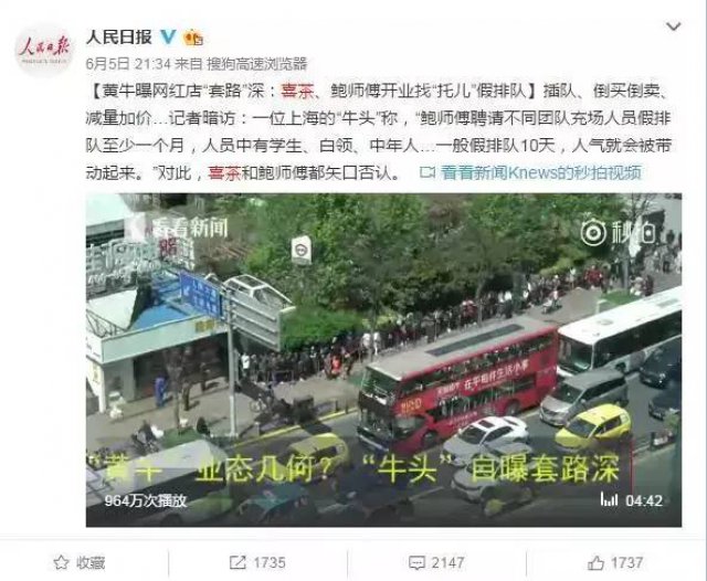 就在你慢慢接受了这个奇葩现象后,一个神转折来了。一段来自看看新闻的视频显示,喜茶、鲍师傅其实都是花钱找“托儿”假排队!