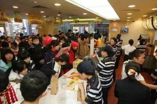 而麦当劳作为快餐业的始祖,力图营造更热闹、快节奏的氛围。纵向排队,顾客之间是背与面的接触,“看不见头”的等待+快节奏就餐方式,刚好迎合了麦当劳的调性。