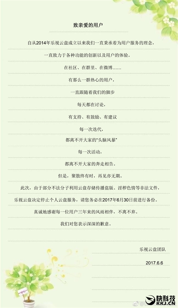 现在,乐视云盘也发布了停服公告,颁布颁发将停止个人云盘办事,具体时间为 2017 年 6 月 30 日。