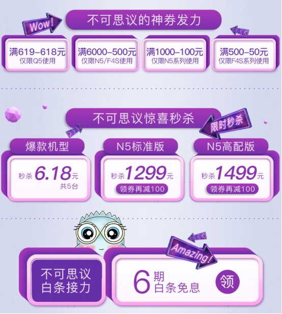 除了以上看点之外,还有其他优惠吗?当然。从6月7日凌晨0点开始,京东消费者可以在360手机品牌日活动页面领取6期白条分期免息券,该券适用于N5、F4S等,消费者可以在打白条时进行免费分期,如此一来不但减轻了消费压力,本身的信用值还会不停累积。此外,针对N5机型有满6000元减500元和满1000元减100元的优惠券可领,针对F4S机型有满6000元减500元和满500元减50元的优惠券可领,不得不说,叠加优惠券之后的产品售价将会极具看点。