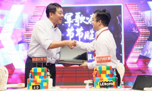 刘军(左)赠送联想拯救者R720 游戏条记本给胡胜利(右)