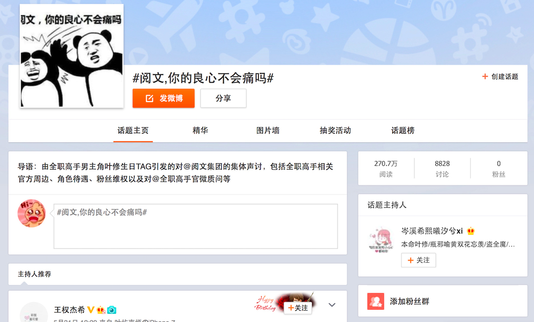 从2014年开始,每年的5月29号,《全职》粉丝们都会将#0529叶修生日快乐#这个生贺TAG刷上微博话题榜,以此为喜欢的角色庆生。但是本年粉丝们发现无法将此TAG刷上榜,粉丝在沟通过程中与阅文官方产生矛盾,撕逼就此开始。