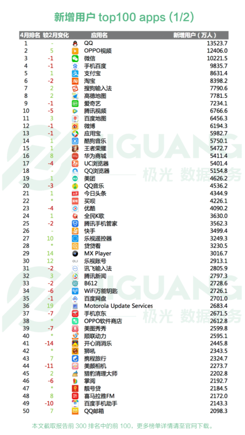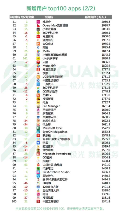 1.极光大数据显示, 4 月新增用户top300 榜单新晋app有买呗( 22 名,4226. 1 万)、贷贷看( 28 名,3230. 5 万)、OPPO软件商店( 38 名,2612. 8 万)等 44 款,跌出前 300 名的app有相片组合、PP手机助手、新浪新闻等 44 款