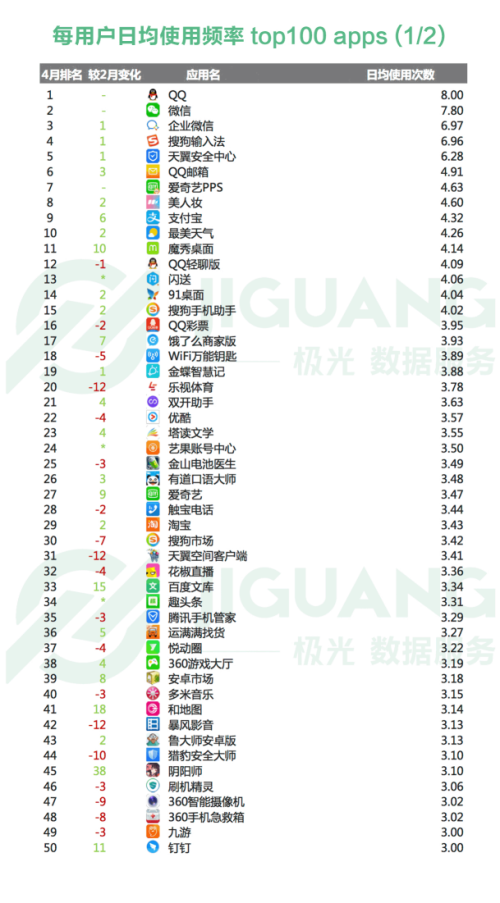 极光大数据显示, 4 月每用户日均使用频率top100 榜单新晋app有闪送( 13 名,4. 06 次)、艺果账号中心( 24 名,3. 50 次)、趣头条( 34 名,3. 31 次)等 18 款,跌出前 100 名的app有好福利、环球TIME、QQ输入法等 18 款