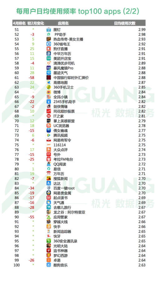五、 4 月每用户使用频率top 100 apps