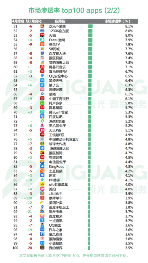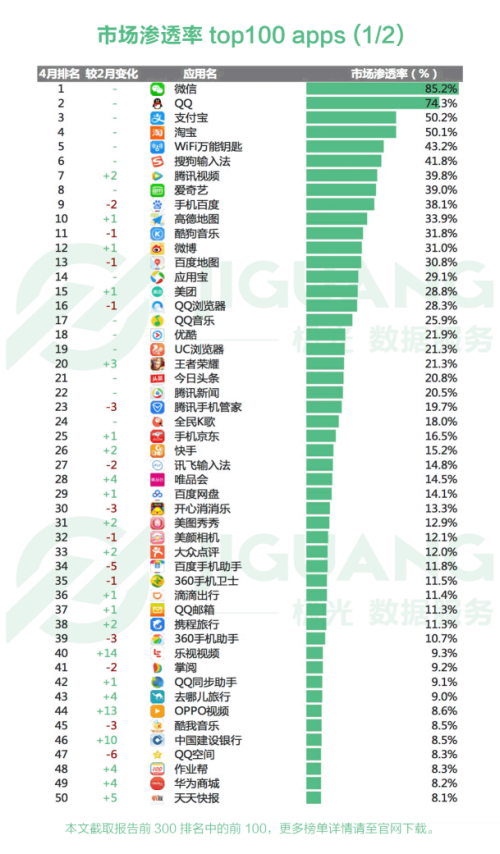一、 4 月市场渗透率top 100 apps