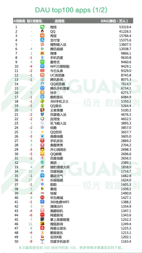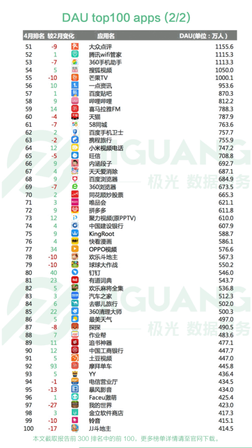 二、 4 月日活跃用户(DAU) top 100 apps
