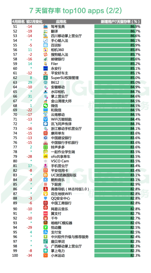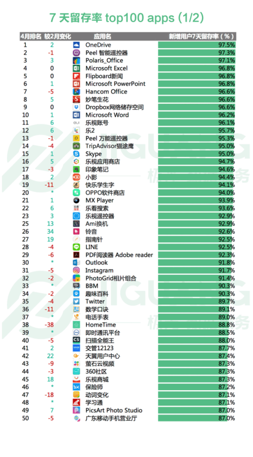 极光大数据显示, 4 月 7 天留存率top