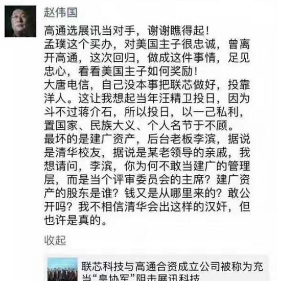 但令业内没有想到的是,就是这样一件在当下芯片产业,尤其是中国芯片产业竞合求发展的今天相当正常的合作,却引发了素有中国芯片产业“国家队”之称的清华紫光的暗讽,更让我们感到震惊的是,紫光集团董事长赵伟国竟然亲自发文炮轰此次合作中的高通中国CEO孟璞是买办,联芯投靠洋人,让其想起了汪精卫投日。那么究竟是什么原因能让赵伟国这个在中国,乃至全球芯片产业称之为“饿虎”(因为疯狂并购相关芯片厂商而得名)人物亲自发文炮轰,甚至在炮轰中不惜夹杂对于个人的攻击?
