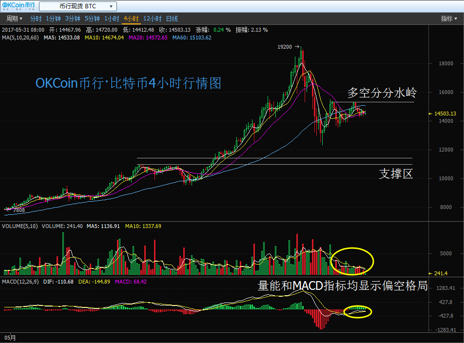 按照国内知名的比特币交易平台OKCoin币行网的数据显示,昨天( 5 月 30 日)币价整体呈窄幅震荡格局,开市后小幅向上攀升,最高涨至午盘的 15300 一线高位后回落,截止当日收盘基本悉数回吐所有涨幅。截止今日发稿前,价格未脱离盘整局面,最新交投于 14570 附近。