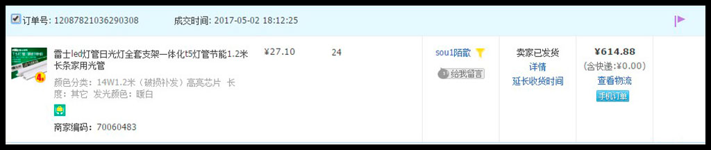 我把收到的快递信封和发货单拍图发给了对方客服询问,该淘宝店客服给我发来一张“订单成交”截图,问我是不是有别人代签了。截图显示的订单号与我收到发货单的订单号一致,成交时间为5月2日18:12,货物是24根单价27.1元的灯管,总价为614.88元。